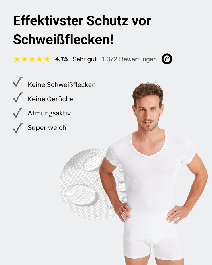 Insgesamt schützt Dich unsere Anti-Schweiß Unterwäsche zu 100% vor Schweißflecken und sorgt dafür, dass Du Dich den ganzen Tag frisch und selbstbewusst fühlst.
